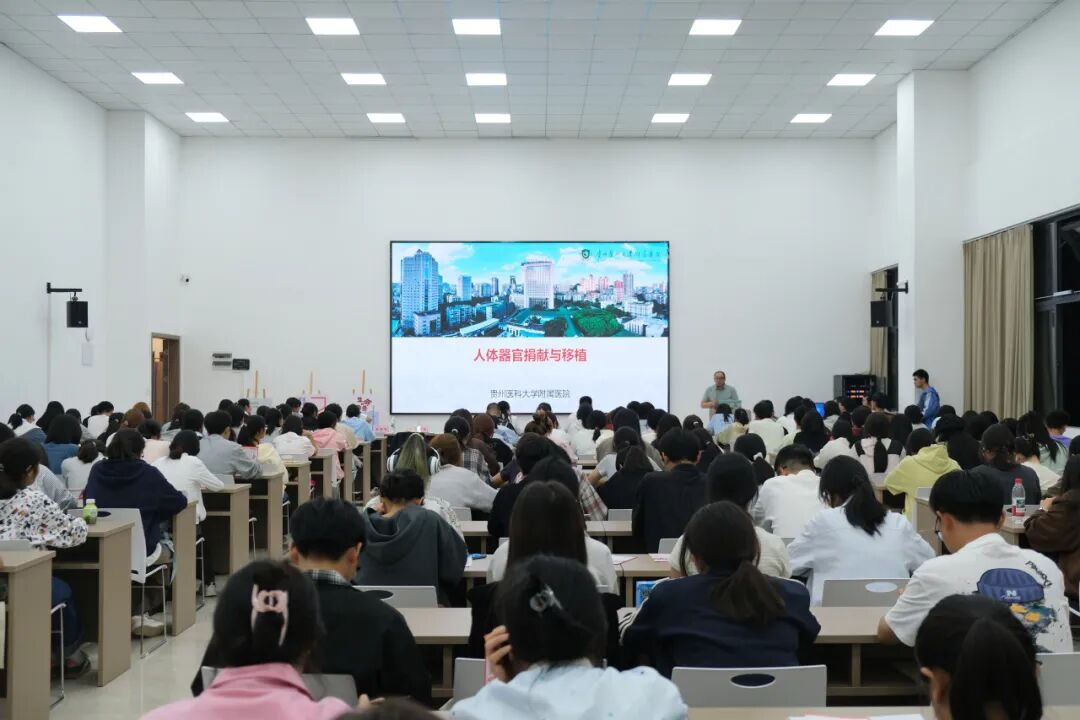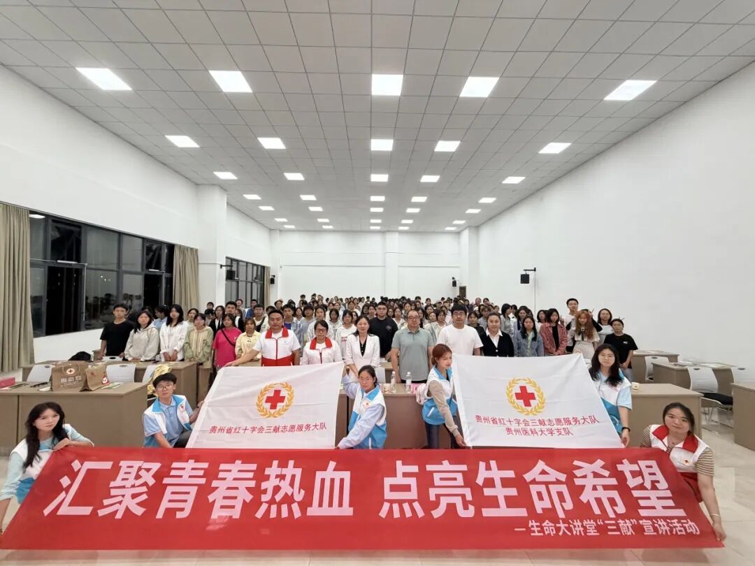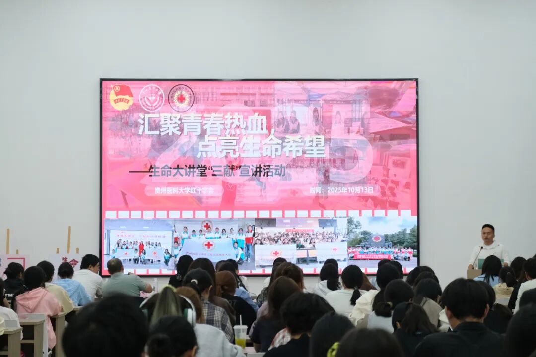 当奉献的种子落入青春的土壤,当生命续写的故事触动医学生的赤诚,10月13日,一场以“汇聚青春热血,点亮生命希望”为主题的“三献”生命大讲堂宣传活动在贵州医科大学温情开展。活动由共青团贵州医科大学委员会、贵州省红十字会志愿服务大队联合主办,吸引了200余名师生参与,会场座无虚席,同学们专注聆听,共同思考献血、造血干细胞捐献、人体器官与遗体捐献背后的温度与意义。