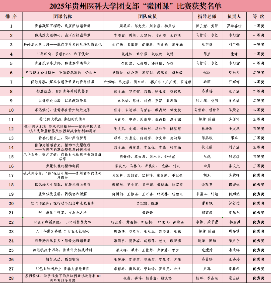 10月9-11日,贵州医科大学举行2025 年团支部“微团课”比赛,各学院团委积极动员组织选拔,共推荐56份作品参加校级比赛,由校团委、宣传部、学工部组成评审组,对作品进行了初审和终审。